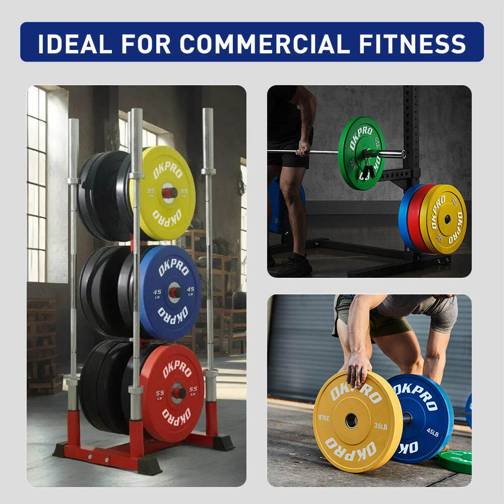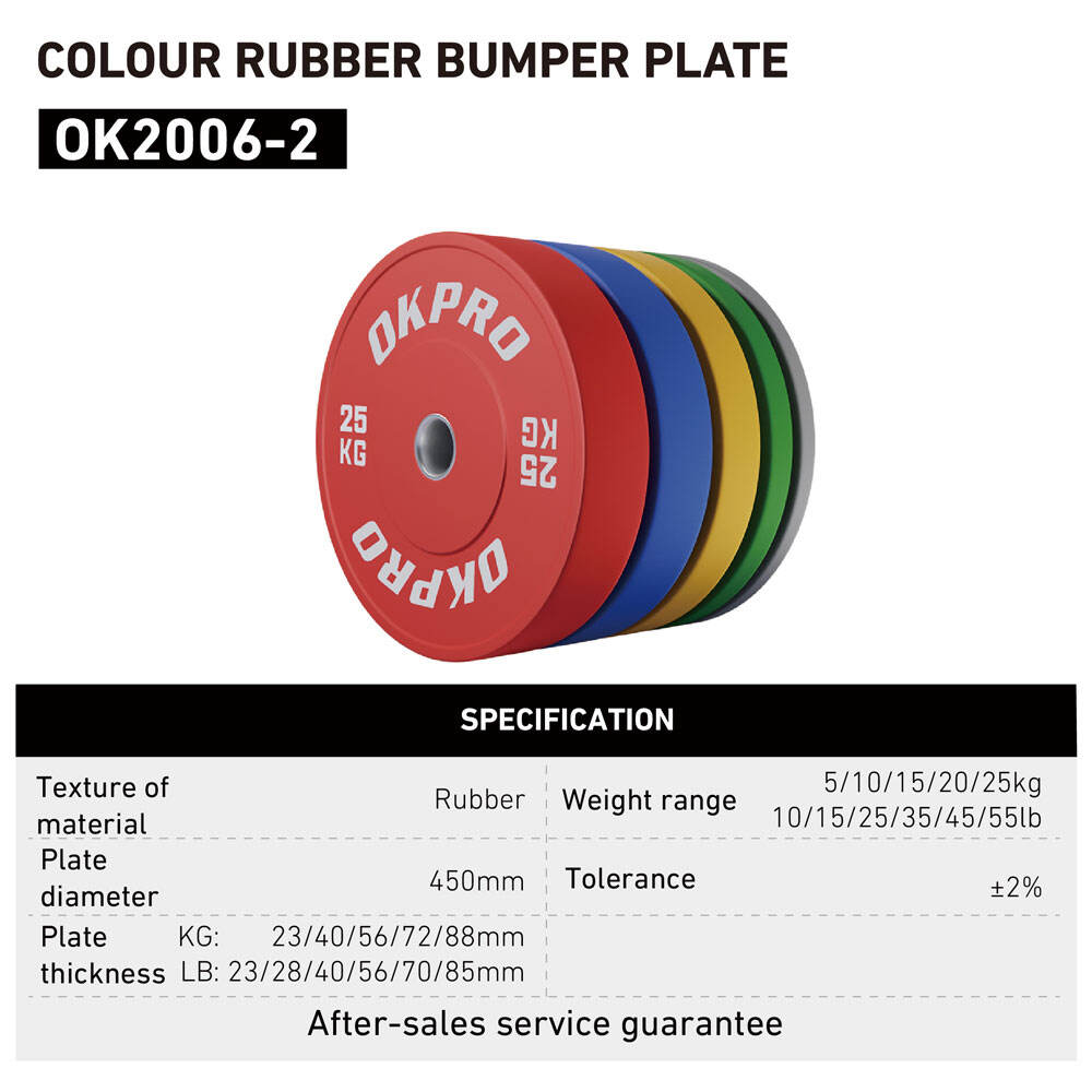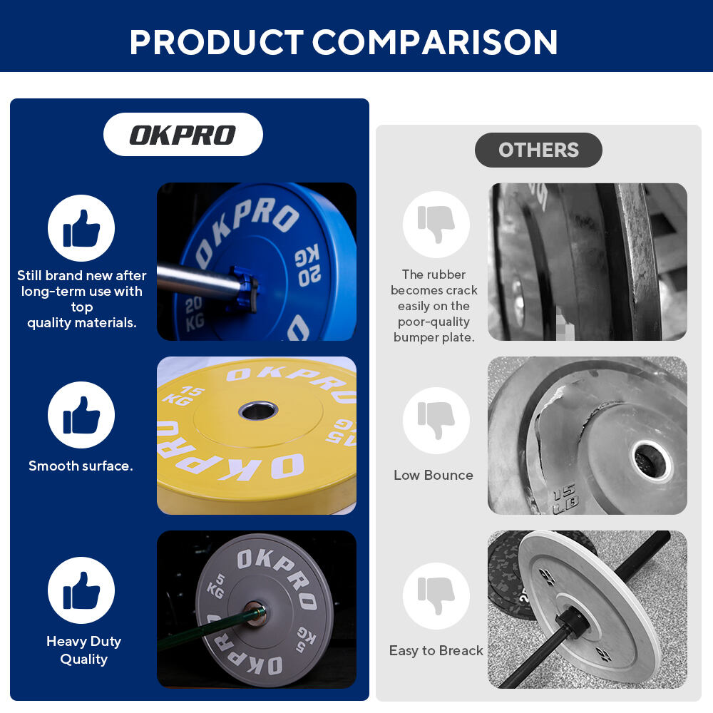OKPRO rubber bumper plates feature a premium rubber coating and a steel core for high quality and durability.Designed specifically for Olympic weightlifting, these bumpers offer low bounce,reducing noise and floor damage during high-impact drops.