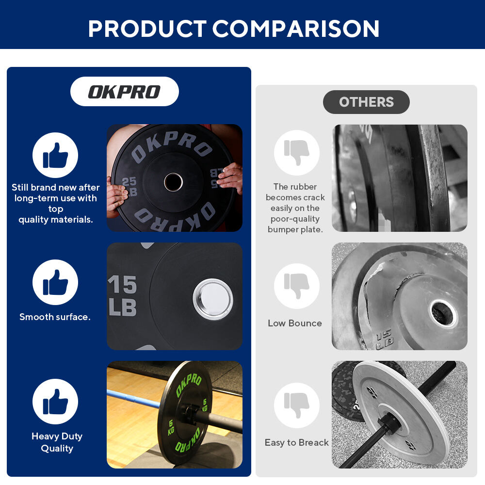 OKPRO Commercial Grade Fitness Equipment is built to withstand the abuse of high traffic gyms, athletic facilities, or residential garage gyms. These bumper plates will last a long time in any setting, they’re the perfect choice if you are looking for a high quality, well priced bumper plate. If you're interested in commercial fitness equipment and are considering a reliable weight plate supplier, OKPRO is the right choice.