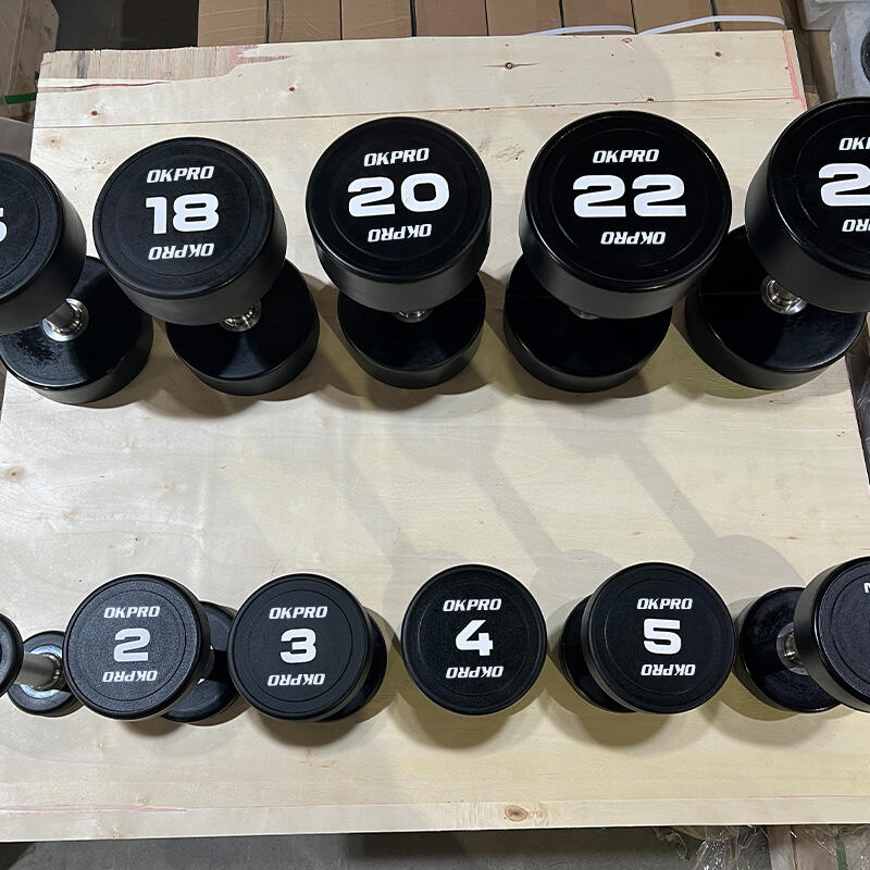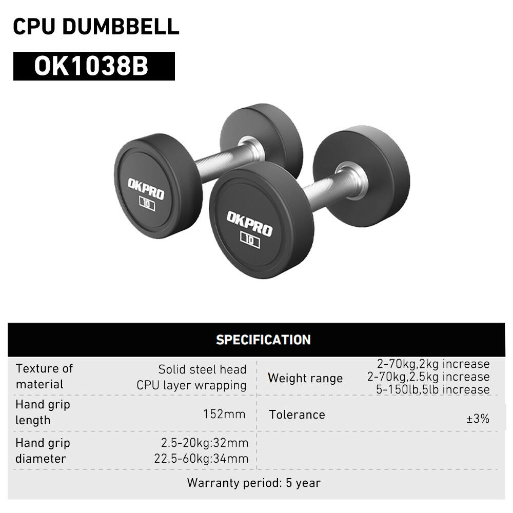 OKPRO's commercial-grade CPU dumbbells offer a wide range of weights, including single and double sets, to meet the diverse needs of beginners and professionals. Each dumbbell features a durable steel core and rubber coating, which resists wear and cracking, reduces noise, and protects floors while maintaining a clean environment. The chrome-plated knurled handles provide a secure, non-slip grip, ensuring safety and stability during high-intensity training.