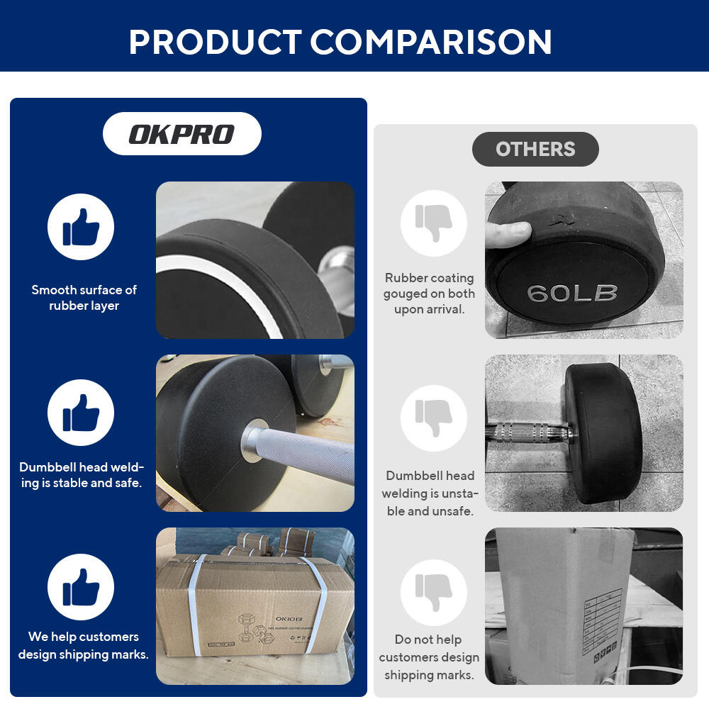 As a professional manufacturer of commercial fitness equipment, OKPRO offers high-quality PU, CPU, and rubber dumbbells featuring non-slip knurled handles, durable coatings, and precise weight tolerances, ensuring every workout is safe, comfortable, and effective. We support OEM/ODM customization, bulk supply, and brand laser engraving, helping gyms, training centers, and distributors create professional, unified training spaces to meet the diverse purchasing and branding needs of our customers.