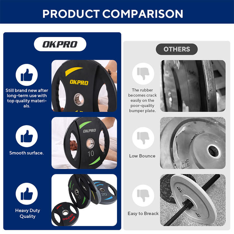 Polyurethane-coated barbell plates, combined with a high-strength steel core, offer a smooth, scratch-resistant surface, vibrant colors, and a long-lasting sheen, making them ideal for long-term gym use and a very cost-effective solution. They also offer low noise and minimal rebound upon landing, effectively protecting floors and equipment. The weight is accurate to the actual product, making them ideal for use in major sporting events. The product's rational design, balancing aesthetics with practicality, meets the bulk purchasing needs of commercial gyms, brand chains, and distributors, making it an ideal choice for professional training and brand display.