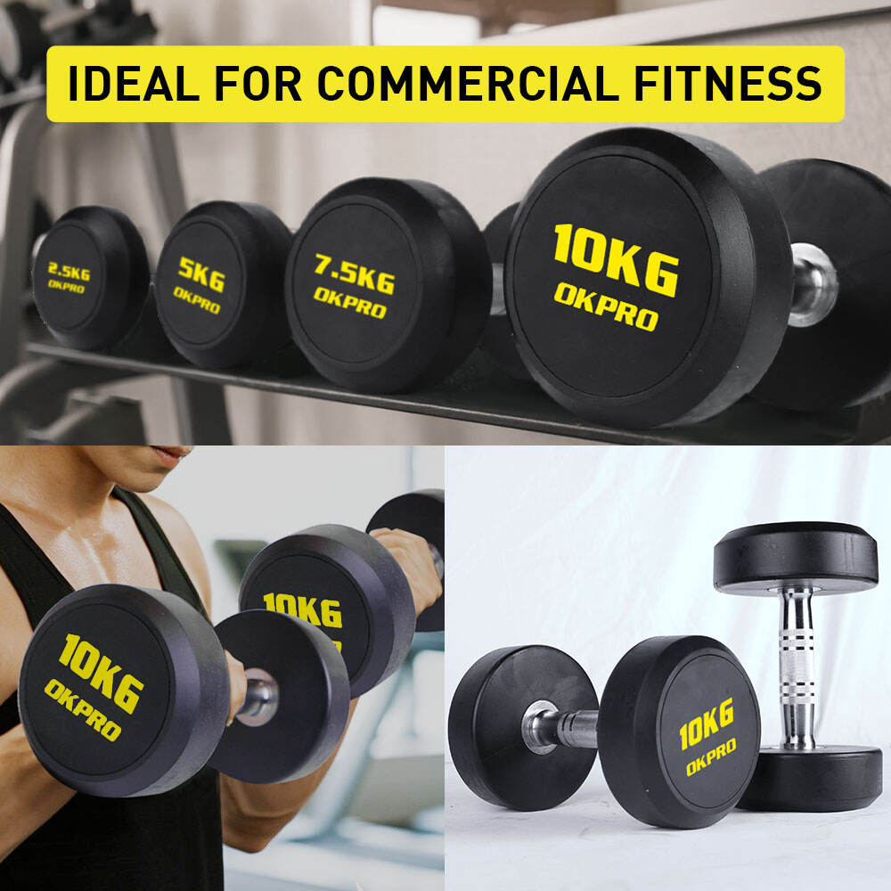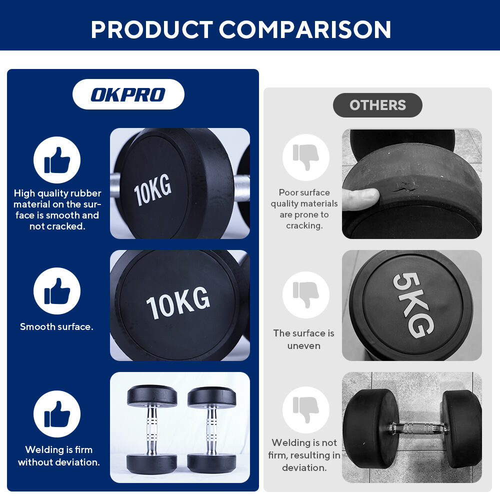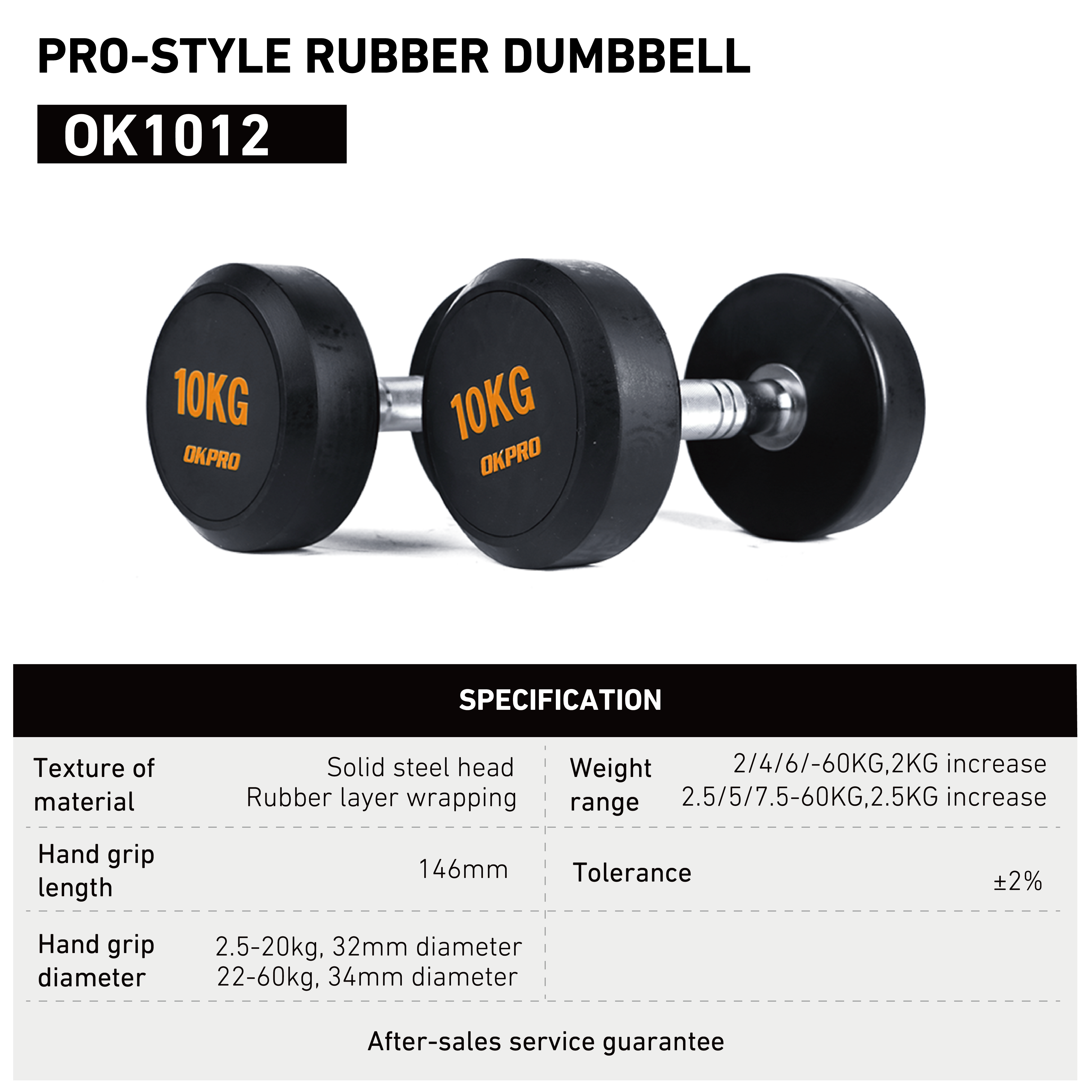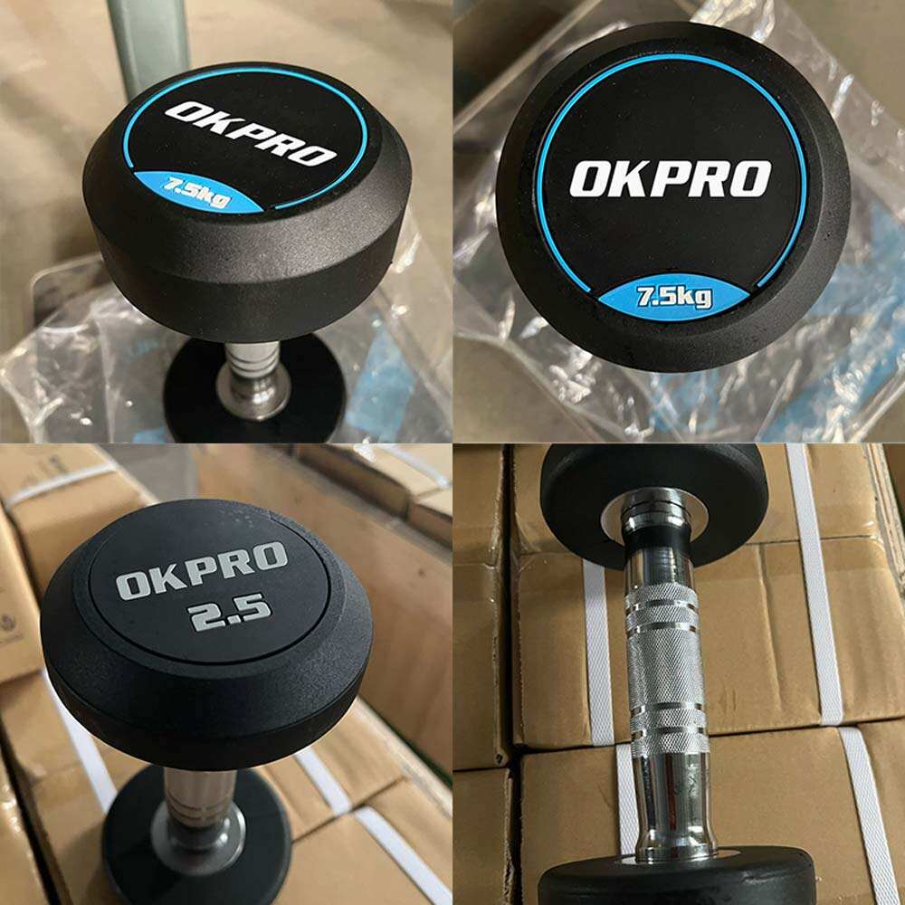 Rubber round dumbbells are a common piece of fitness equipment found in gyms.OKPRO rubber dumbbells made from pure virgin rubber—odourless, clean, and free from powdery residue.Dumbbells feature a round head covered in durable rubber.This design enhances both aesthetics and comfort.