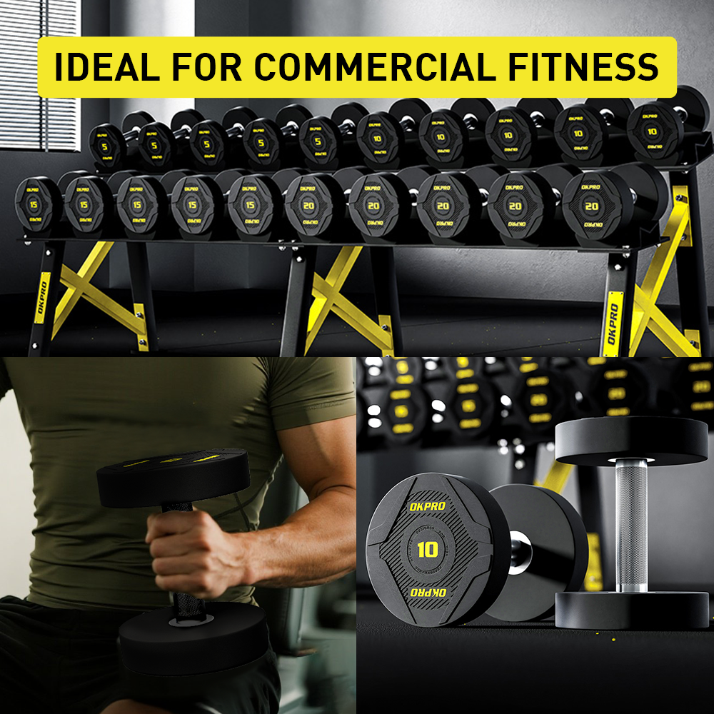 OKPRO's design makes these dumbbells easy to carry and store.Most importantly, the professionally designed chrome-plated handles provide essential grip and safety during use.The patented design adds a unique touch to any commercial gym.