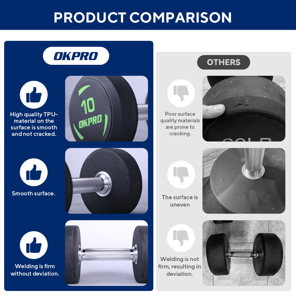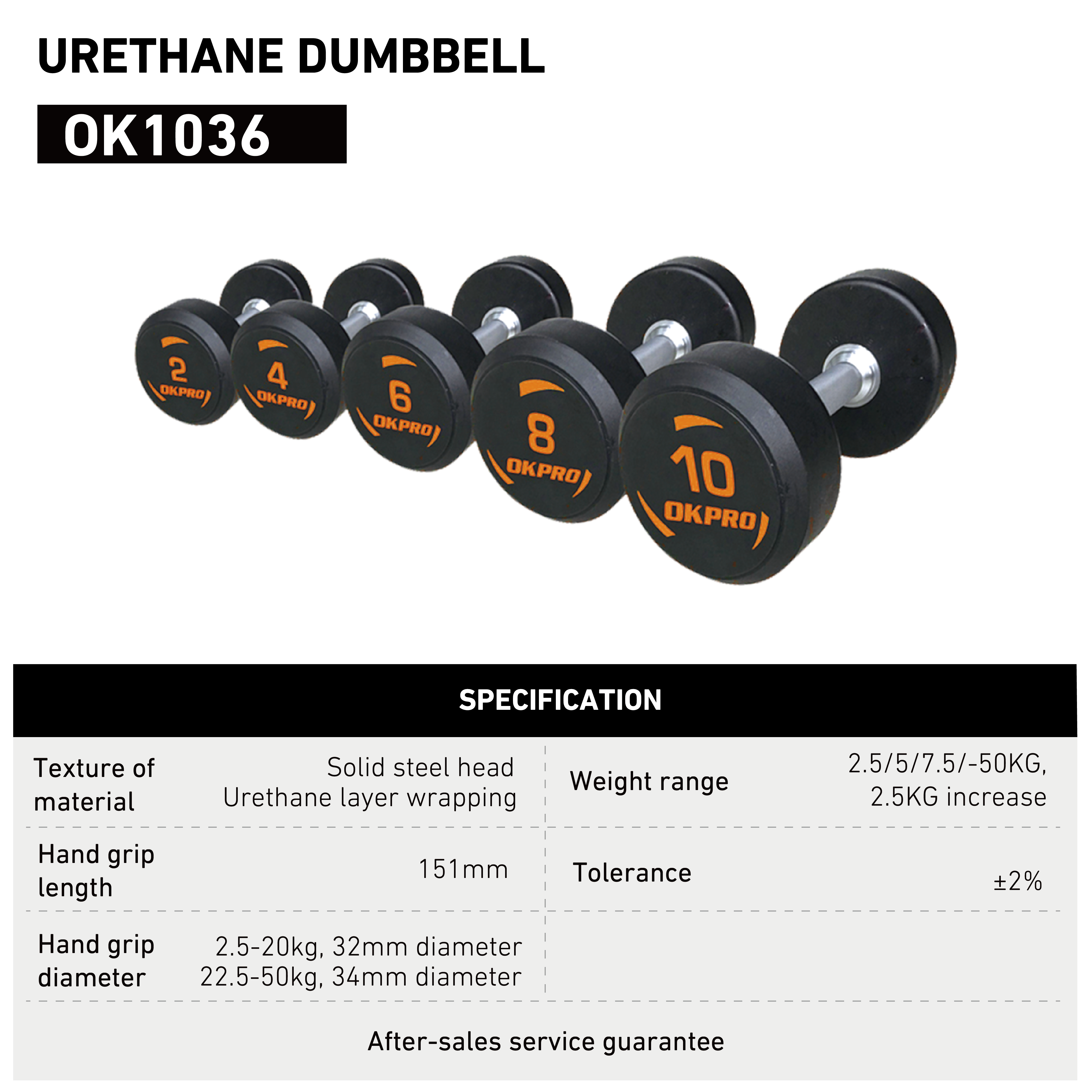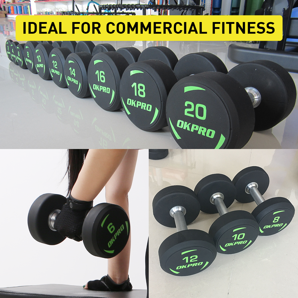 OKPRO polyurethane dumbbells are designed specifically for commercial gyms and high-traffic fitness centers. Their sturdy steel core is coated with a safe polyurethane coating. This coating reduces noise and prevents floor damage, providing exceptional durability and wear resistance. These premium polyurethane dumbbells are essential tools for fitness enthusiasts and professional athletes. Precision-balanced, they offer peak strength training with weights ranging from 2.5 to 50 kg.