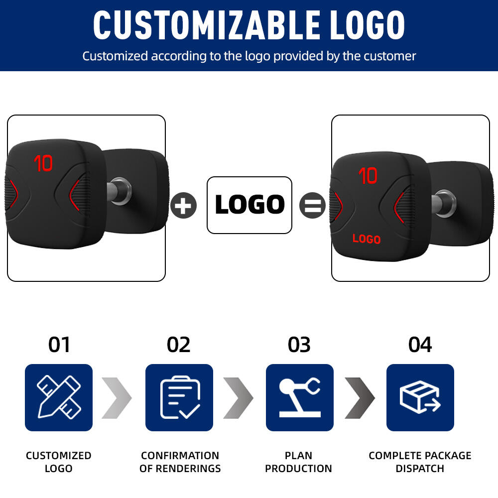 High-quality Urethane (PU) dumbbells with a square design are suitable for commercial gyms. Durable PU coating protects the floor and non-slip design ensures a safe grip. They support a variety of strength training and functional exercises and can be customized.