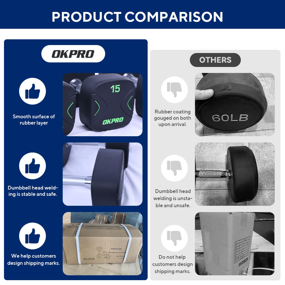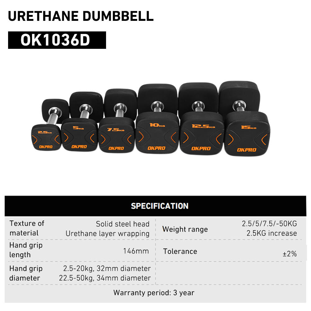 OKPRO is a professional manufacturer of commercial fitness equipment, dedicated to providing high-quality strength training solutions to gyms, training centers, and dealers worldwide. Our Urethane (PU) dumbbells feature a high-quality polyurethane coating that resists wear and cracking, protects the floor, and reduces training noise, making them ideal for commercial gyms and fitness studios. A wide range of weight options cater to diverse fitness levels. Easy to clean, durable and reliable, they maintain their appearance over time, helping commercial gyms reduce maintenance costs. With OEM/ODM capabilities, OKPRO offers comprehensive support for global customers, including bulk customization, exclusive branding, and fast delivery, making your fitness space more professional and efficient.