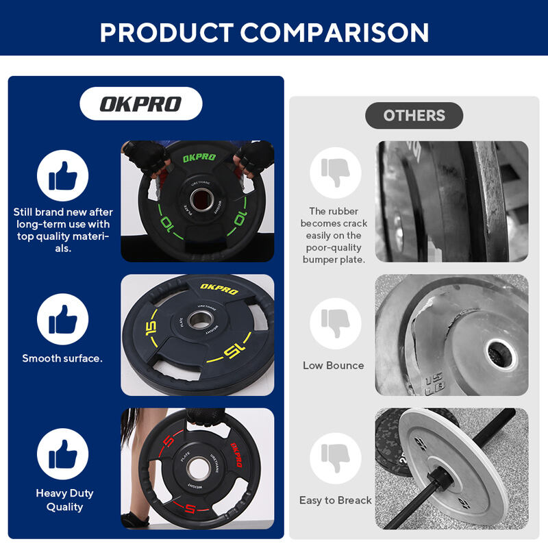 OKPRO leverages 14 years of experience in fitness equipment manufacturing to serve professional commercial gyms, large fitness centers, and fitness equipment wholesalers. Each plate features a solid steel core coated with high-quality polyurethane, ensuring resistance to wear, damage, and color instability, even after years of heavy use.