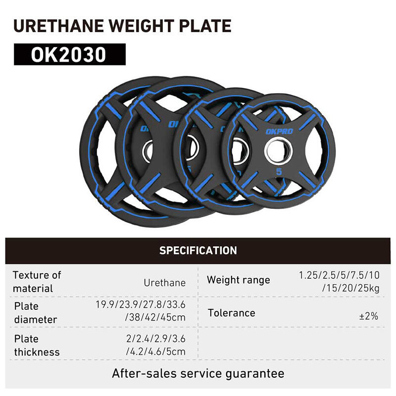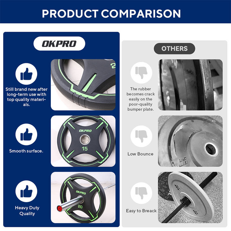 OKPRO durable polyurethane barbell plates, with exclusive patented design, precise weight and excellent balance, are ground-proof, impact-resistant and wear-resistant, making them suitable for CrossFit and commercial gyms.